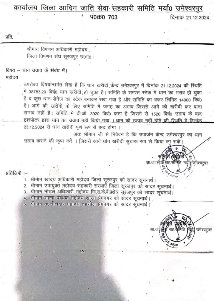छत्तीसगढ़ में सरकार समर्थन मूल्य पर धान की खरीदी कर रही है. इस बीच उमेश्वरपुर धान खरीदी केंद्र में आज धान खरीदी बंद हो सकती है. समिति प्रबंधन ने जिला विपणन अधिकारी को पत्र लिखकर धान खरीदी बंद किए जाने का कारण बताया है.