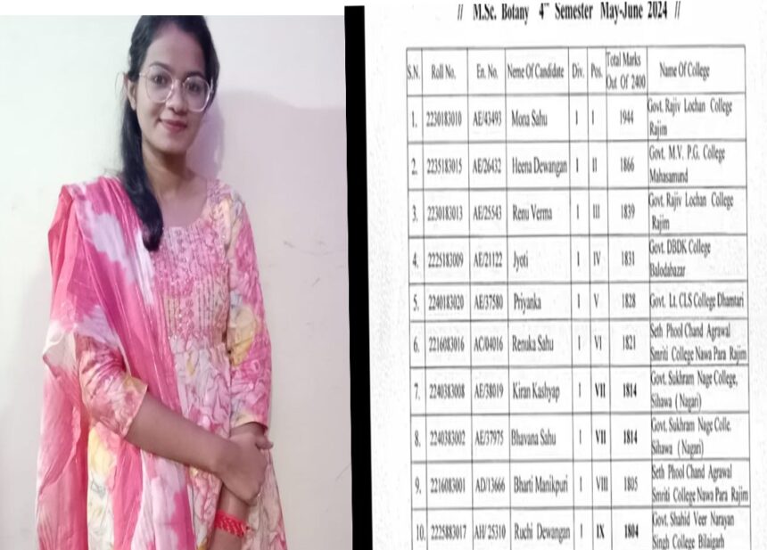 बारहवीं में भी प्रथम स्थान प्राप्त कर नगर का गौरव बढ़ाया वही आगे उच्च शिक्षा की पढ़ाई वीर सुरेन्द्र साय महाविद्यालय गरियाबंद से बी . एस.सी. व महासमुंद शासकीय एम .वी. महाविद्यालय महासमुंद में एम. एस.सी.की पढ़ाई वनस्पति विज्ञान में की और महासमुंद में सभी सेमेस्टर में प्रथम स्थान प्राप्त कर महाविद्याल महासमुंद का गौरव बढ़ाया है अपनी इस सफलता के लिए अपने माता पिता अपने परिजन के साथ साथ सभी गुरुजनों को श्रेय दिया हैं.