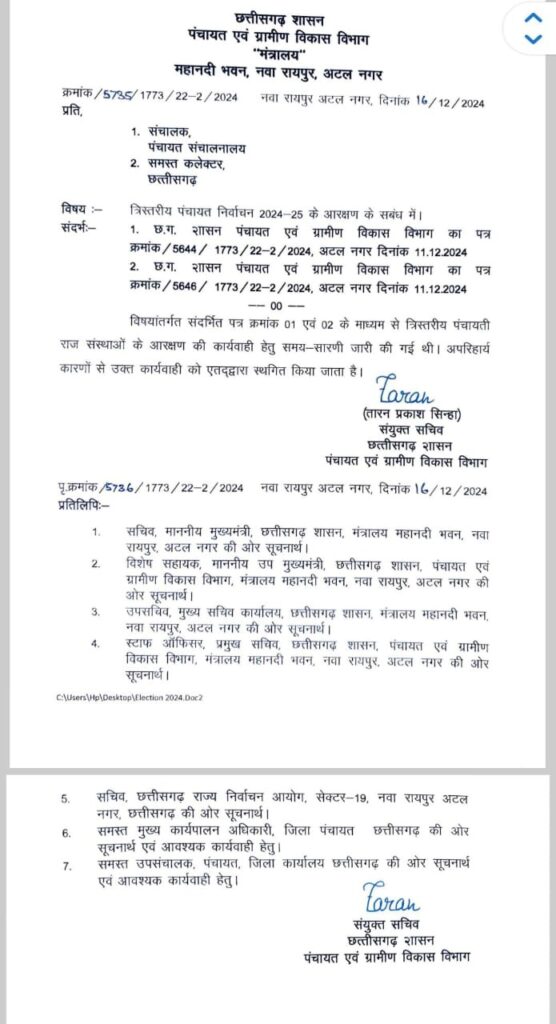 छत्तीसगढ़ में त्रिस्तरीय पंचायत चुनाव को लेकर बड़ी खबर सामने आ रही है, आगामी दिनों होने वाले आरक्षण की प्रक्रिया स्‍थगित कर दी गई है। बता दें पंचायत विभाग ने इसके लिए आदेश भी जारी कर दिया है।