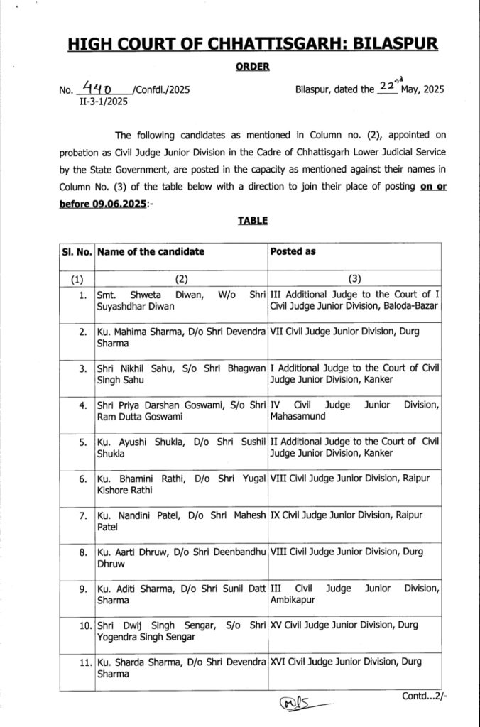 इस बार जिन युवा और प्रतिभाशाली उम्मीदवारों को नियुक्ति मिली है, उनमें श्वेता दीवान, महिमा शर्मा, निखिल साहू, प्रियदर्शन गोस्वामी, आयुषी शुक्ला, भामिनी पटेल, नंदिनी पटेल, आरती ध्रुव, अदिति शर्मा, द्विज सिंह सेंगर, शारदा शर्मा, ताप्ती राघव, आदित्य जैन जैसे नाम प्रमुख हैं। ये सभी अब अपने-अपने जिला अदालतों में न्यायिक कार्यभार संभालेंगे।