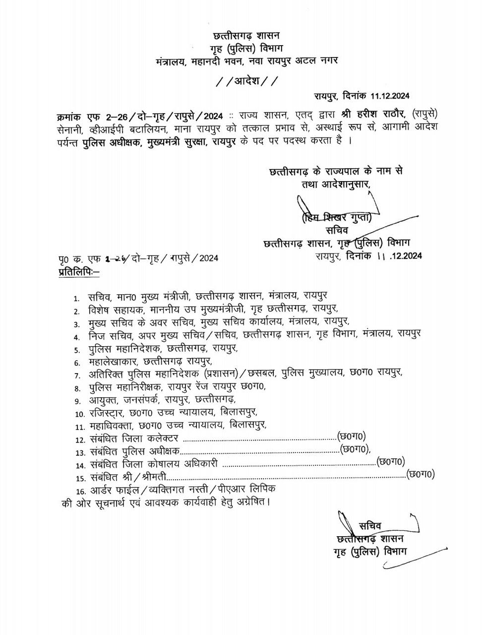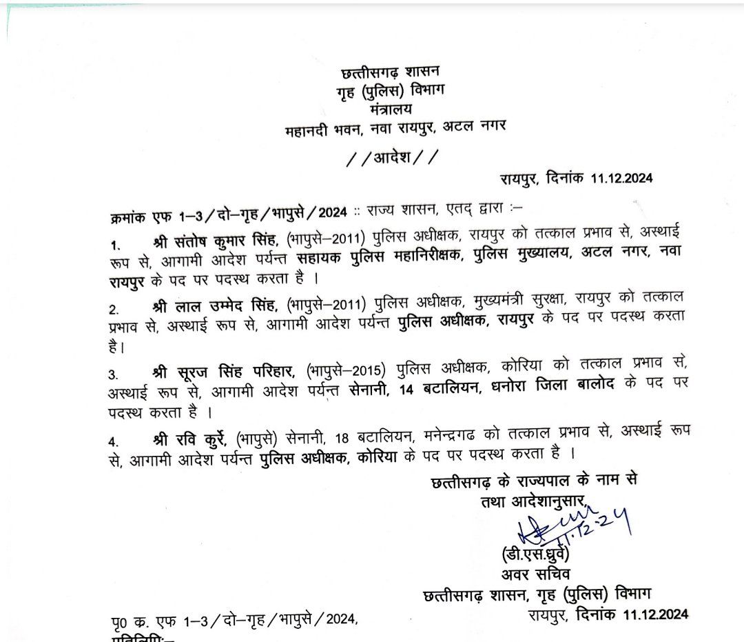राज्य शासन ने लाल उम्मेद सिंह रायपुर के नए एसपी बनाया है, वहीं एसएसपी संतोष सिंह को एआईजी पुलिस मुख्यालय बनाया गया है। वहीं हरीश राठौर को मुख्यमंत्री विष्णुदेव साय के सुरक्षा SP बनाया गया है, रवि कुर्रे को कोरिया का नया एसपी बनाया गाय है। सूरज सिंह परिवार को बालोद बटालियन ट्रांसफर किया गया है।