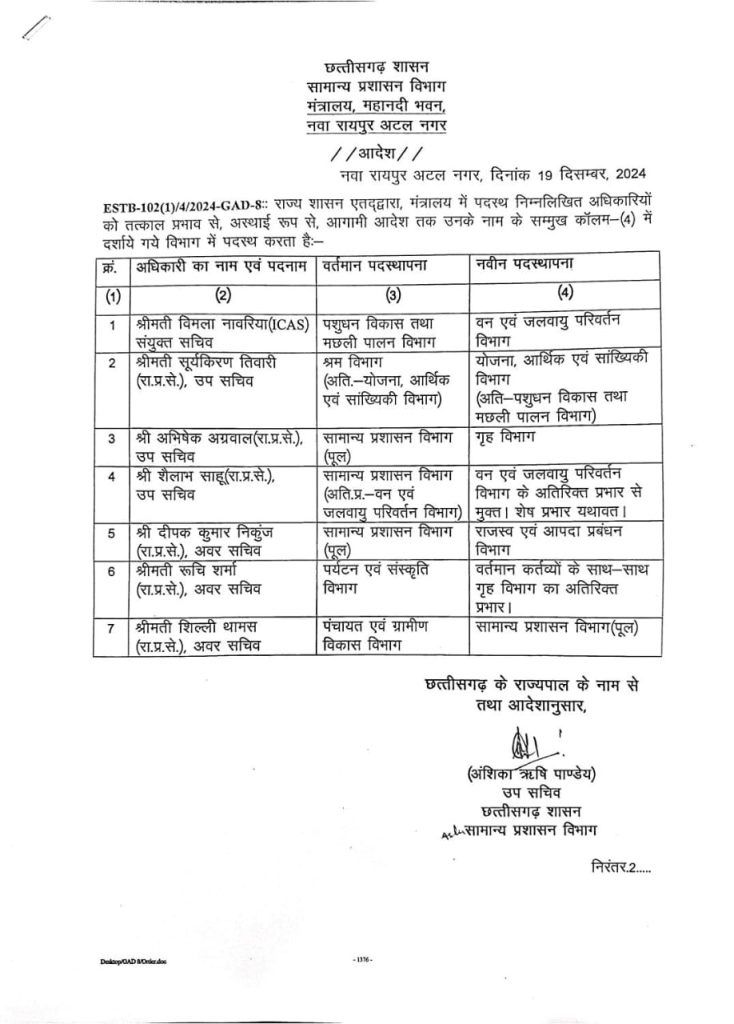 सूची के मुताबिक़ राप्रसे की वरिष्ठ महिला अधिकारी सूर्यकिरण तिवारी को श्रम विभाग से अलग करते हुए उन्हें योजना, आर्थिक और सांख्यिकी विभाग में तैनात किया गया है। इसी तरह सामान्य प्रशासन विभाग में पदस्थ रहे अभिषेक अग्रवाल अब गृह विभाग में अपनबी सेवाएं देंगे। आप भी देखें पूरी सूची..