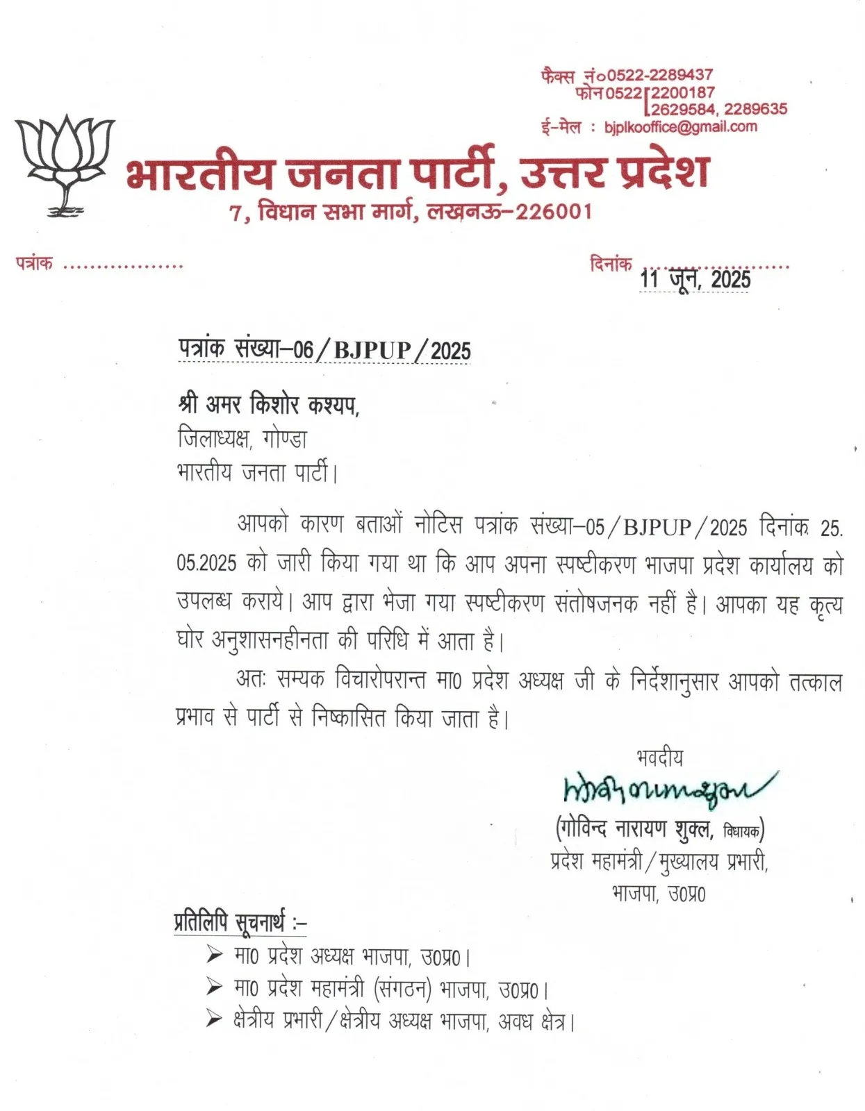 पार्टी ने पत्र जारी करते हुए लिखा कि आपको कारण बताओं नोटिस पत्रांक संख्या-05/BJPUP/2025 दिनांक 25. 05.2025 को जारी किया गया था कि आप अपना स्पष्टीकरण भाजपा प्रदेश कार्यालय को उपलब्ध कराये। आप द्वारा भेजा गया स्पष्टीकरण संतोषजनक नहीं है। आपका यह कृत्य घोर अनुशासनहीनता की परिधि में आता है। अतः सम्यक विचारोपरान्त मा० प्रदेश अध्यक्ष जी के निर्देशानुसार आपको तत्काल प्रभाव से पार्टी से निष्कासित किया जाता है।