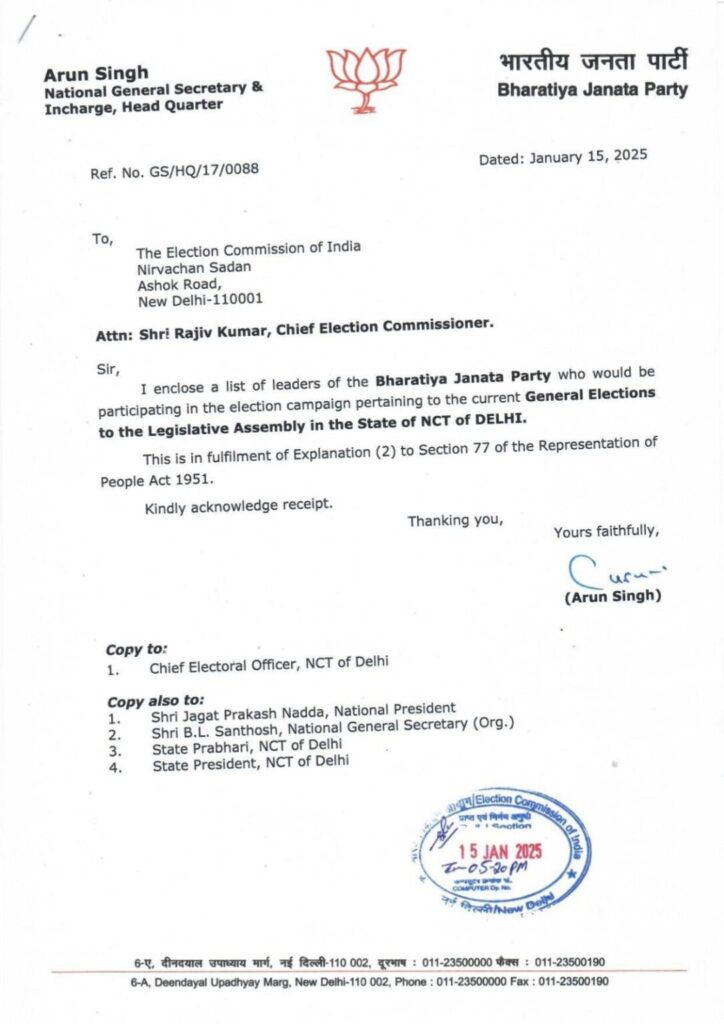 दिल्ली विधानसभा चुनाव के लिए भाजपा के स्टार प्रचारकों के नामों का ऐलान किया है, लिस्ट में प्रधानमंत्री नरेंद्र मोदी, भाजपा के राष्ट्रीय अध्यक्ष जेपी नड्डा और केंद्रीय गृह मंत्री अमित शाह के नाम शामिल हैं।
