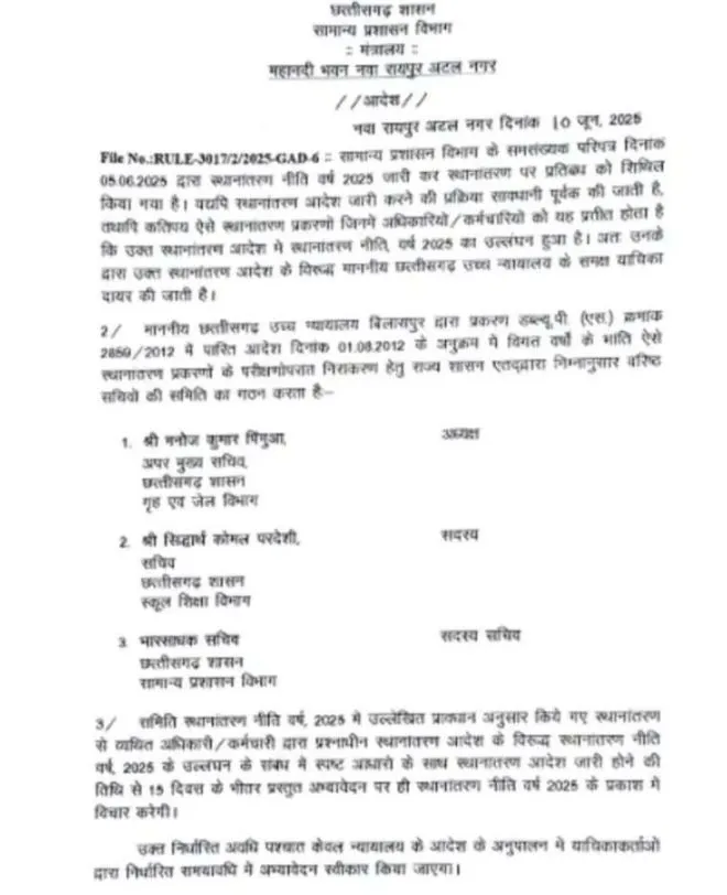 माननीय छत्तीसगढ़ हाईकोर्ट बिलासपुर द्वारा प्रकरण डब्ल्यूपी (एस) क्रमांक 2889/2012 में पारित आदेश दिनांक 01.08.2012 के अनुक्रम में विगत वर्षों के भांति ऐसे स्थानांतरण प्रकरणों के परीक्षणोपरात निराकरण हेतु राज्य शासन एतद्वारा निम्नानुसार वरिष्ठ सचिवों की समिति का गठन करता है