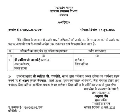 The post MP IAS Posting: 16 दिन बाद दतिया को मिला नया कलेक्टर, सतना अपर कलेक्टर स्वप्निल वानखेड़े को जिम्मेदारी appeared first on Thepublic News.