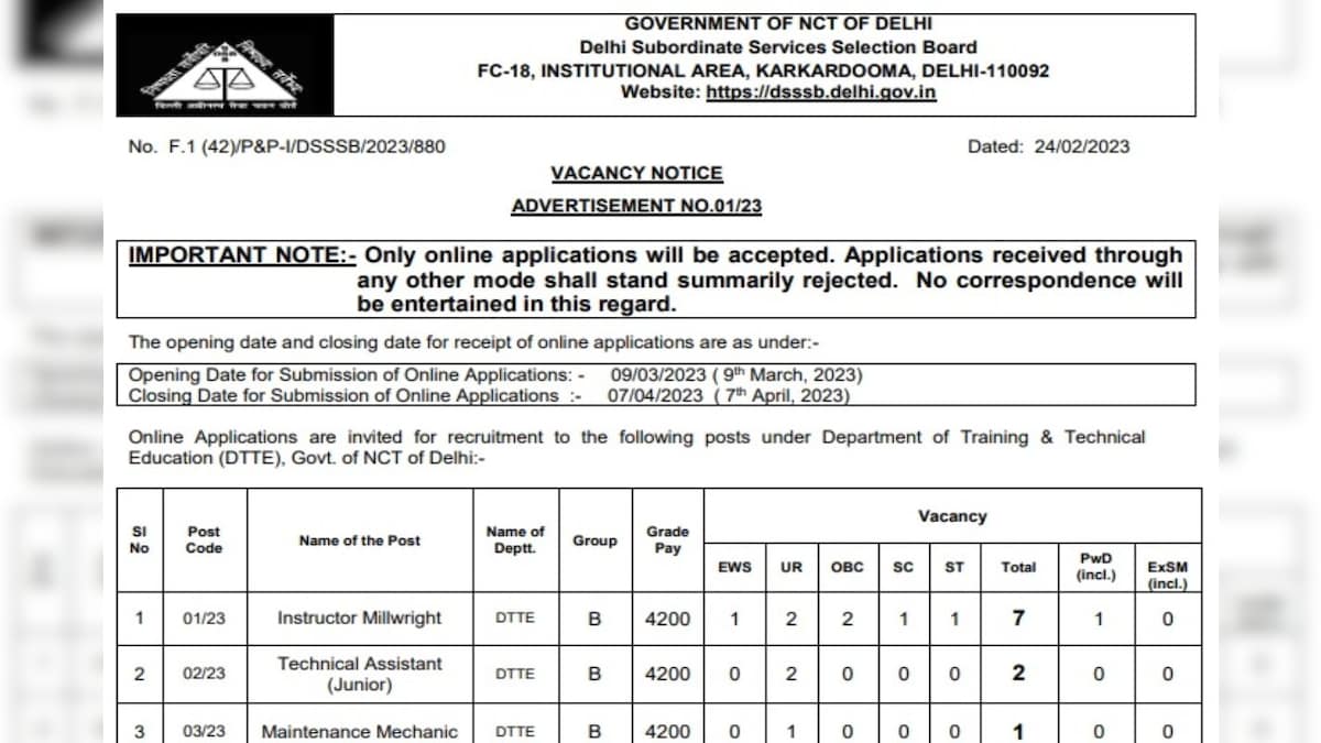 DSSSB Recruitment 2023 Sarkari Naukri: दिल्ली अधीनस्थ सेवा चयन बोर्ड (DSSSB) ने ग्रुप B के कई पदों पर 258 रिक्तियों के लिए एक नोटिफिकेशन जारी किया है. DSSSB Bharti के तहत ऑनलाइन आवेदन 09 मार्च 2023 से शुरू होंगे और आवेदन 07 अप्रैल 2023 तक चलेगा.