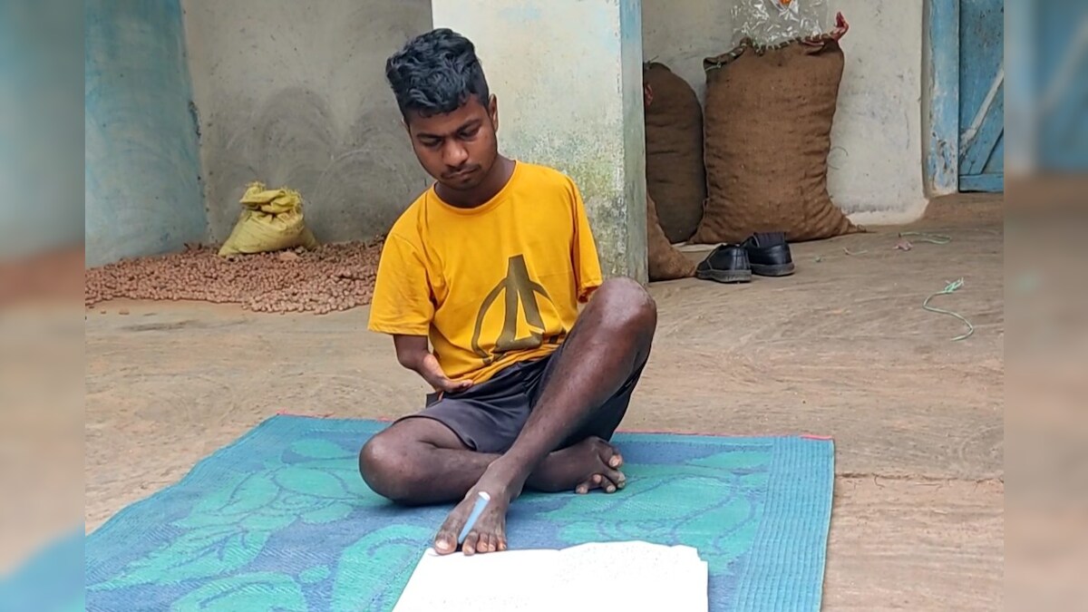 अंबिकापुर के ग्राम डिगमा में रहने वाला 17 वर्षीय महेश सिंह जो बचपन से ही दिव्यांग है. महेश का एक हाथ नहीं है और दूसरा हाथ अविकसित है. महेश को पढऩे का जुनून है इसलिए हाथ ना होते हुए भी बचपन से पढ़ाई के लिए अपने पैरों को ही सहारा बना लिया है
