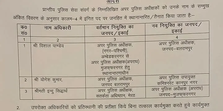 विशाल पाण्डेय – वर्तमान में अम्बेडकरनगर में अपर पुलिस अधीक्षक (नगर-पश्चिमी) पद पर तैनात विशाल पाण्डेय को अब बलरामपुर में अपर पुलिस अधीक्षक के रूप में नियुक्त किया गया है।